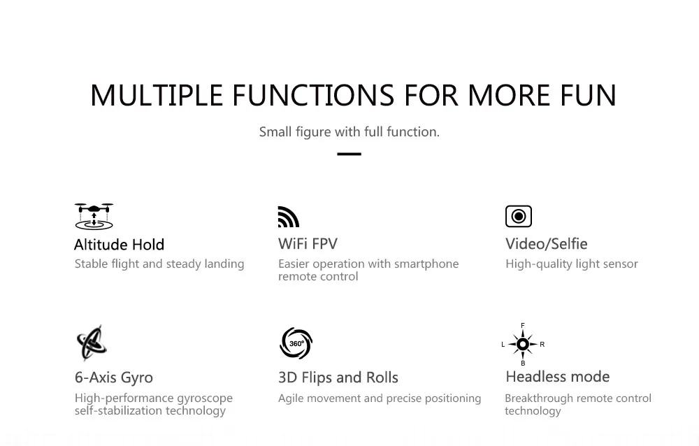 With Headless Mode/ no need to adjust the position of aircraft before flying It has 6-axis gyro which can have more stable flying and be easy to control 4 Channel which can do ascend, descend, forward, backward, left sideward fly, right sideward fly and rolling 360° Model structure makes propellers more powerful and can resist stronger wind Battery capacity is up to 400mAh which makes a longer flight One key to return function makes it easily to find the way home Lightweight airframe with nice durability With LED light, possible for night fly High-speed aerobatics High-speed rotation Synchronized rotation 3D Mode